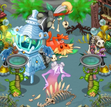 An ancient, primal being. Necrullian Fibsettus is a skeletal figure who uses it's crystal technicolor exoskeleton to lure creatures for food. Though many monsters think that the sigiled center of the poinsettia is the front of its head. Little do they know that it's the back of a skull from a creature that no one has identified in the monster world...