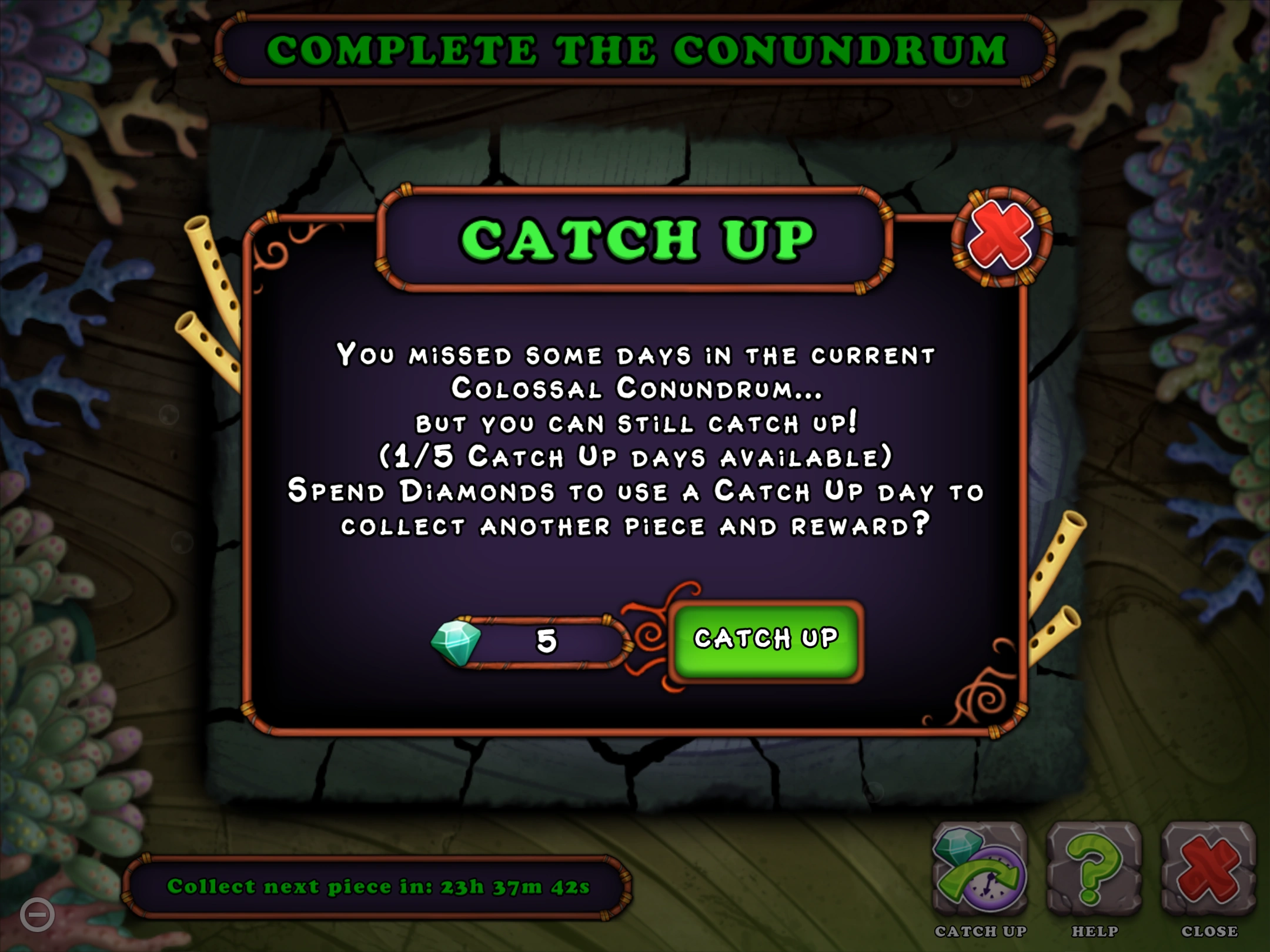 The Colossal Conundra are a daily puzzle introduced during Anniversary Year. There are 32 pieces of the puzzle, and each day the player can collect a piece as well as a reward. Monsters, Costumes, and Structures are collected from the Market in their corresponding sub-menu. The amount earned from Coin