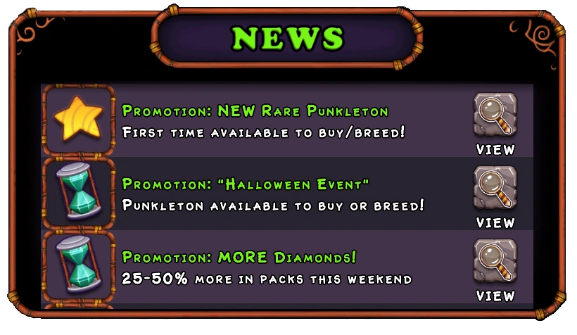 The News was where all new information within My Singing Monsters could be found. It has since been replaced by Mailbox, in Version 2.1.0. This included, but was not limited to, promotions, new merchandise, system messages and links to the MSM social media accounts. Promotions such as Daily Deals, a Rare Duet, and special events were also located in the News tab. To view an article in the News, one would've had to tap "View" to the right of the article.