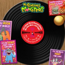 The My Singing Monsters vinyl record set includes some soundtracks from both My Singing Monsters and its prequel, Dawn of Fire. The soundtracks are not updated to the current release and there are 2 sides each holding multiple songs, (e.g. Plant Island lacks anything past Dipsters, and for some reason lacks Shugabush, likely due to copyright issues) The record is a translucent dark blue.