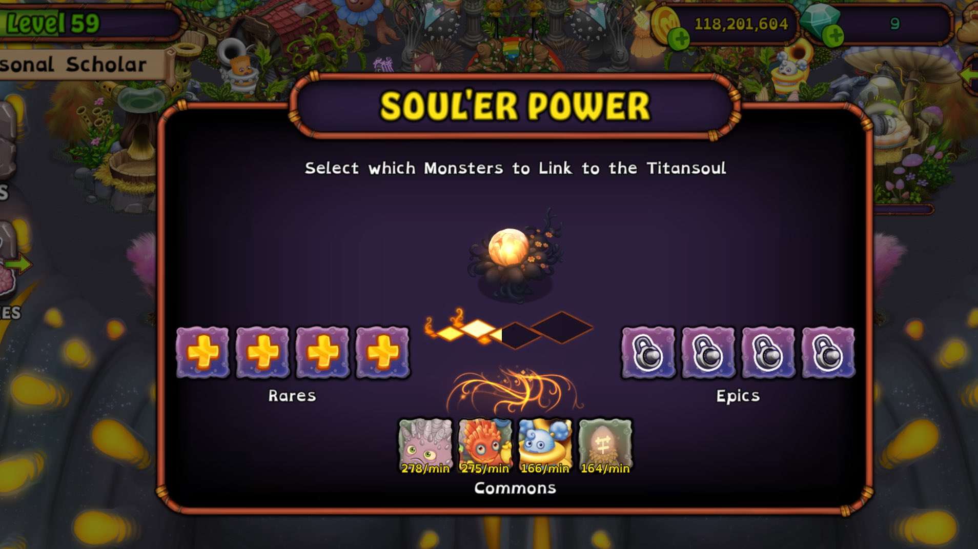 )) and then Diamonds (starting at 5 Diamonds and increasing by 5 Diamonds after every purchase); the cost will reset at 3:00pm UTC. The cost to unlink is the same. Once linked to the Phosphoran Phlox, a Monster will contribute a certain amount of Soul'er Power. The amount contributed is dependent on the Monster's Coin production, with higher production rate giving more Soul'er Power. There are four nodes seen inside the Titansoul menu, These are filled by getting a certain amount of Soul'er Power, with each one being filled unlocking a new sound to be produced by the Phosphoran Phlox. Once all four nodes have been filled, you are able to wake up the Titan in the same manner as the Colossal Conundra.