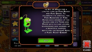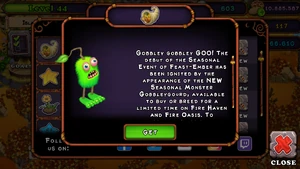 Dive into Fire Haven to discover a NEW SEASONAL EVENT: Feast-Ember! This heartwarming time of year is all about sharing in nature's delectable bounty - and who better to share it with than the lovable NEW SEASONAL MONSTER, Gobbleygourd? This intensely cheerful Monster is thrilled to finally join the ranks of its fellow Seasonals and host a festive Feast-Ember celebration for all Monsters to see. Joining the festivities on Fire Haven are the bite-sized DIPSTERS and newly-opened STARSHOP! Buy or breed Gobbleygourd for a limited time on Fire Haven and Fire Oasis.